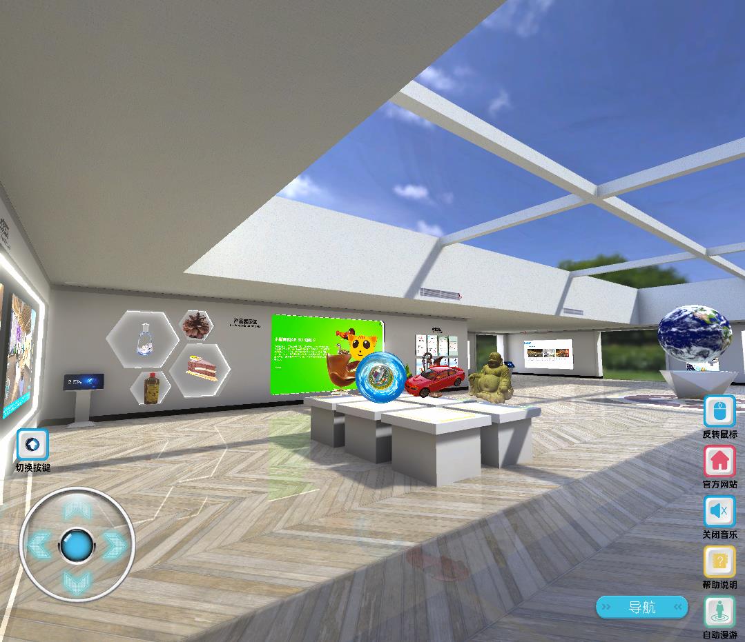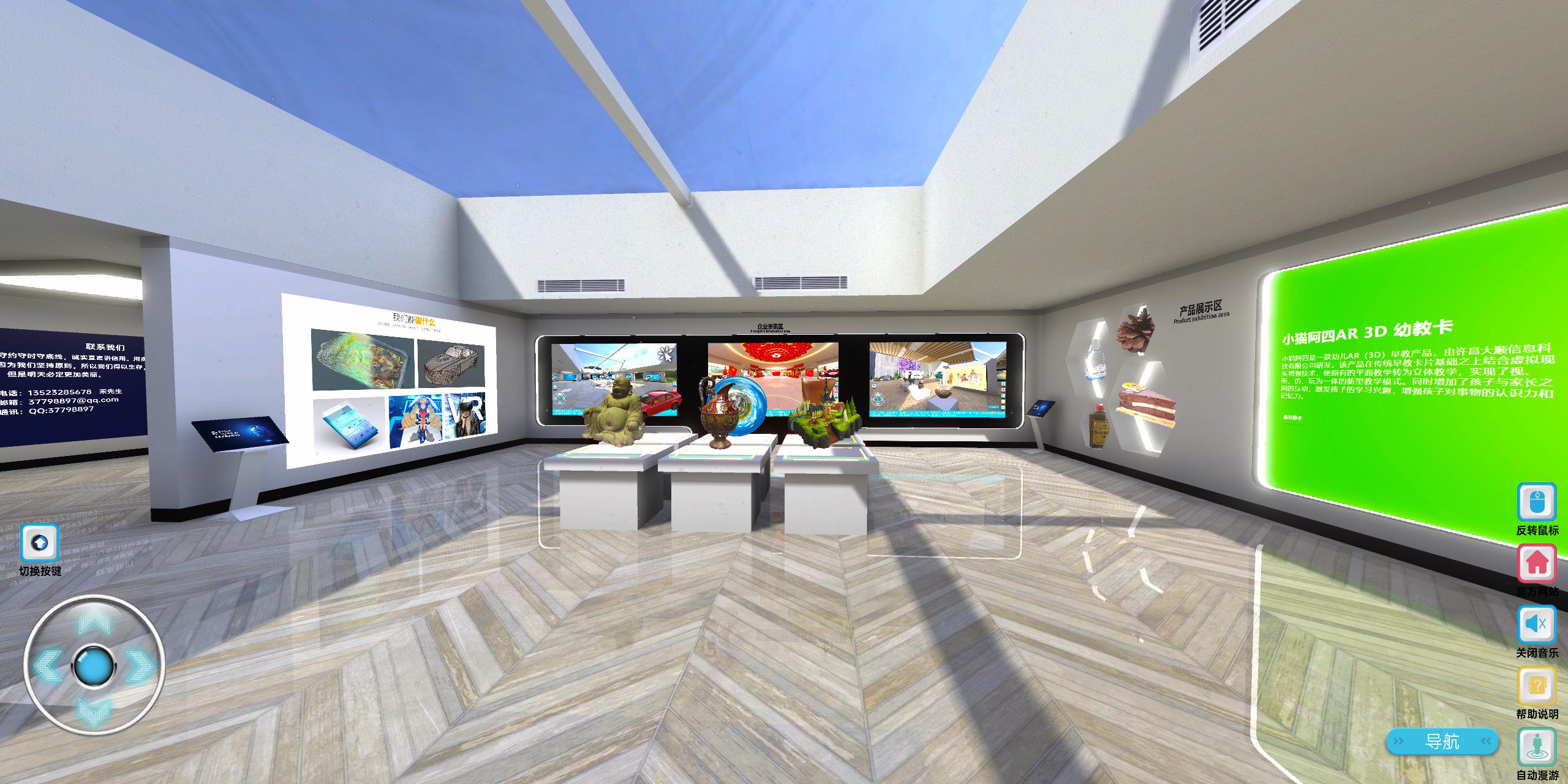 超大面积展厅 图文、视频、三维产品展示 跨平台展示,主动自动漫游 自定义音乐或解说词 50+展位灵活填充。